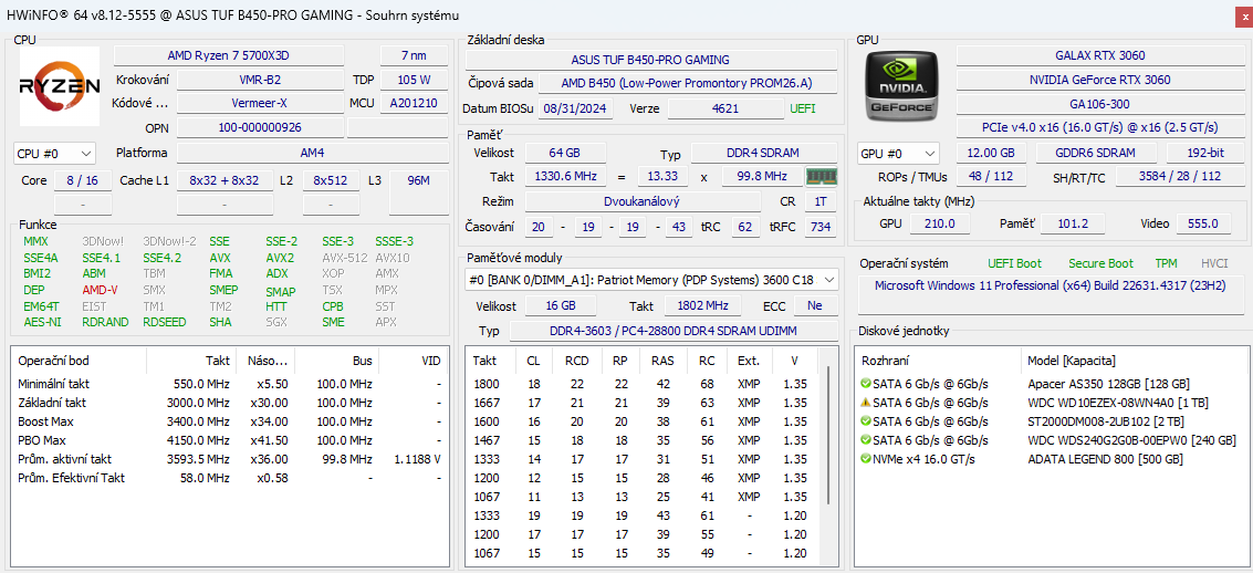 Základní deska: B450 PRO GAMING ,CPU Ryzen 5700X3D,GPU Nvidia Galax RTX 3060,Patriot Viper Steel 64GB KIT DDR4 3600Mhz CL18,Zdroj:RM 750x / Case: SilentiumPC Signum SG1X TG RGB