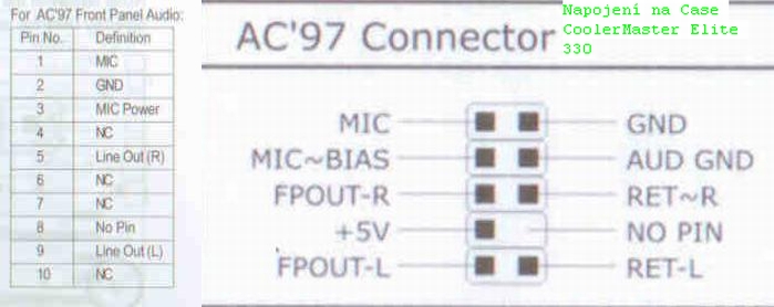 Neskládám sice počítače, ale výměnu, případně zapojení nových komponent zvládnu, takže bych to mohl zkusit. Akorát nevím přesně kam patří jednotlivé piny na výstup z bordu. MB je Gigabyte GA-P35-DS4 a case Coolermaster elite 330, který podporuje pouze AC´97. Ty jednotlivé piny z case mají označení MIC IN,