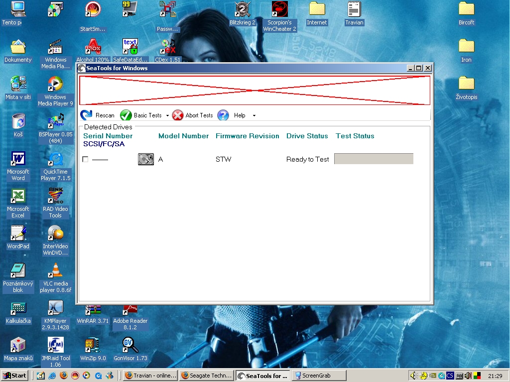 Stáhl jsem SeaTools na kontrolu disků. K instalaci jsem potřeboval ješte .NET assembler 2.0. Ten jsem taktéž stáhl a naistaloval. Při spuštění SeaTools nejprve probíhá hledání disků. Po hledání se zobrazí následující chyba: