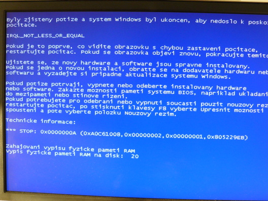 Prosím o radu nepravidelně mi počítač vyhodí modrou obrazovku,skoušel jsem testovat paměti programem memtest86 několikrát a vždy mi test vyšel bez chyb. taky jsem zkusil opravit windows xp pro a při instalaci mě naspalo asi toto systém neprošel testem kompatability software nebude nainstalován.