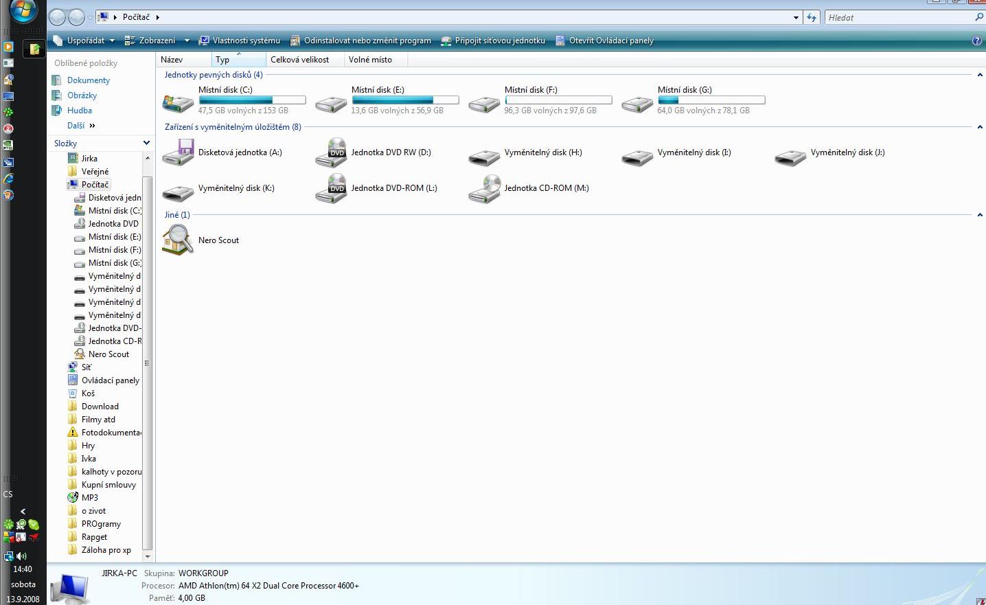 Kdyz uz je tady tema externi disk,tak to zaradim sem.Lidi,mam problem s externim diskem.Disk bezi,ovladace jsou nainstalovany,v diskovych jednotkach je taky,ale ja ho nemuzu nikde v pc najit !!!Teoreticky by se mel objevit v tento pocitac.Mne se ale objevuje v prvni rade C:,ten mam na sys atd.,pote tam mam na trikrat rozdelen jeden E:+F:+G:,to je na bordel,pak uz ale nic.V druhe rade mam klasika A:,disketovka,kterou uz jsem odinstaloval,pac ji ani nemam,D:,coz je mechanika,H:+I:+J:+K:,vymenitelne disky alias ctecka karet a posledni L:+M:,virtualni mechanika (daemon).Screen k dispozici.