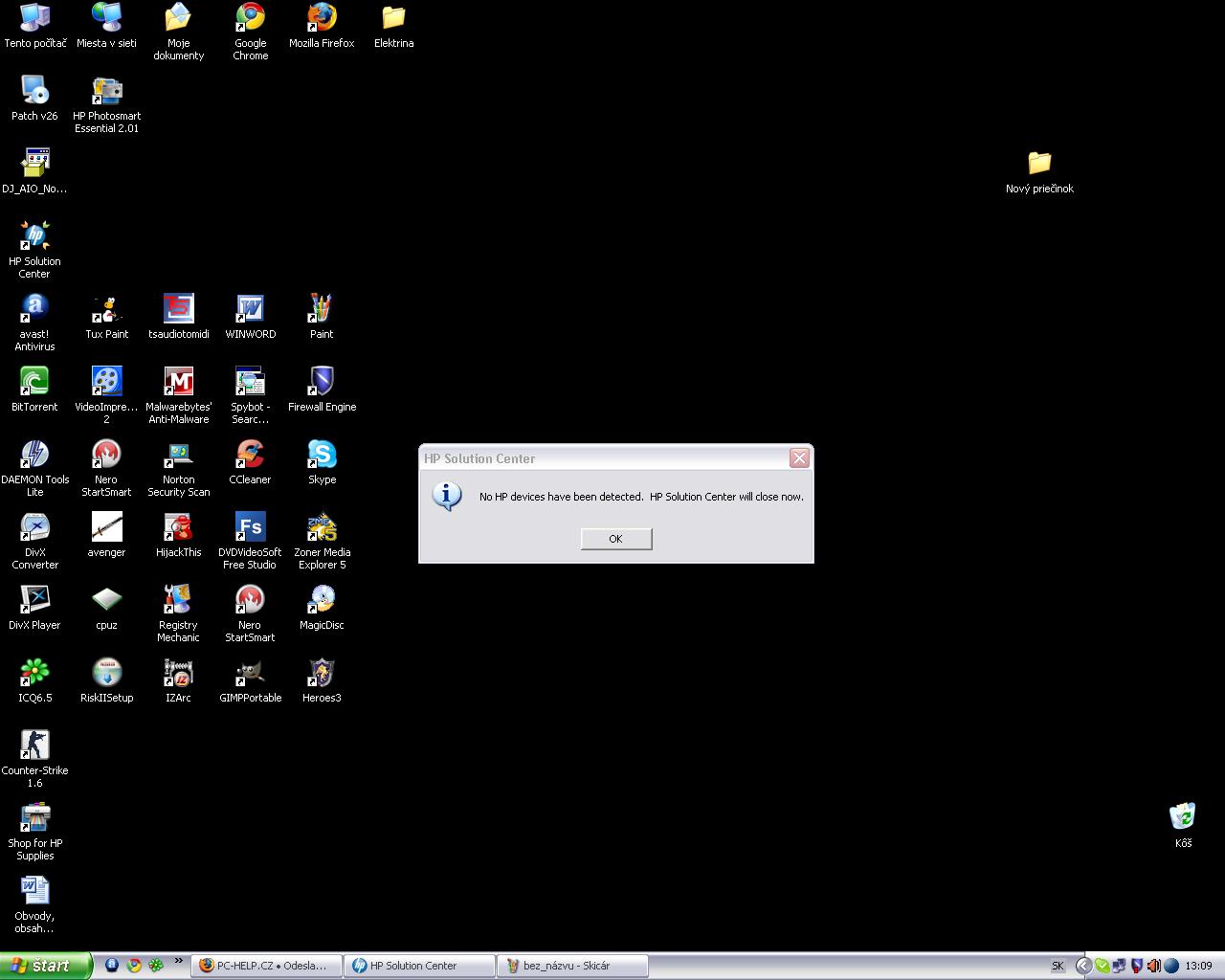 Ahojte, mám problém z tlačiarňou (vlastne je to multifunkčné zariadenie). Pôjdem hneď k veci. Mám novú tlačiareň asi 2 mesiace. Všetko v pohode funguje až na to že po nejakom čase prestala spolupracovať s PC. Stalo sa to asi tak že keď som dal niečo tlačiť tak mi to nevytlačilo, ale zobrazovalo sa mi to dole v lište že mi to tlačí (všetko t.j. farba, papier a ostatné tam bolo). Tak som skúsil tlačiareň odinštalovať že ju nanovo nainštalujem. Lenže čo to. Stratil som inštalačné CD-čko. Tak som bol nejakú dobu (asi 2 týždne) bol bez tlačiarne, že hádam sa to CD niekde nájde. Lenže dneska ma napadlo stiahnuť i ho. Tak som dnes našiel na oficiálnej stránke HP driver k tejto tlačiarni a nainštaloval som ho. Bolo to presne to isté ako to čo bolo na tom CD. Tak som dúfal že to pôjde. Lenže čo to. Tlačiareň sa mi naďalej nezobrazovala a keď si chcem ísť pozrieť či je pripojená v HP solution center, alebo v Digital imaging monitor, tak mi tam vyhodí túto tabuľku.