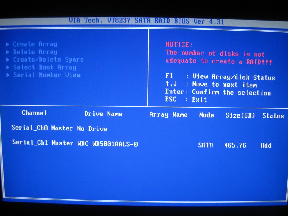 Za prve máš disk připojen až na druhý port, tak připoj datový kabel na konektor na základní desce označený SATA1. Jak píše El Diablo, snažíš se vytvořit RAID pole s jedním diskem, což není dobré. Tlačítkem Esc toto okno Biosu ukonči a běž do Integrated Pheripherals a vlož sem toho obrázek.