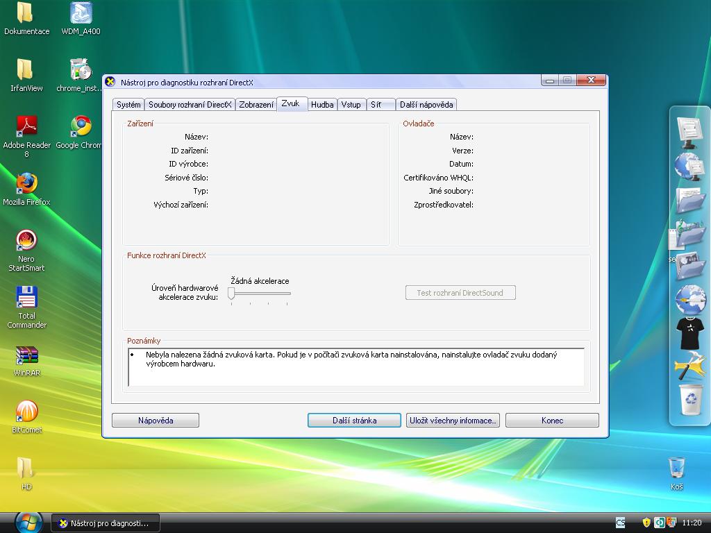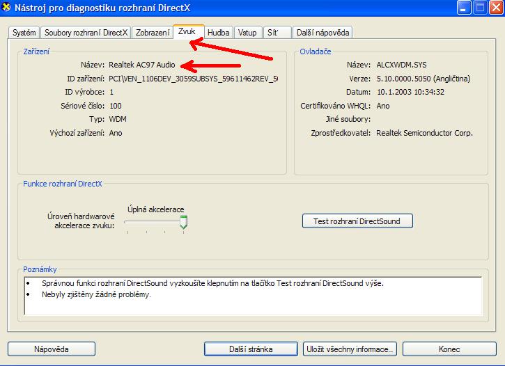 Co máš za zvukovku ? Start - Spustit - "tam napiš dxdiag" - Enter. Potom klikni na záložku Zvuk.
