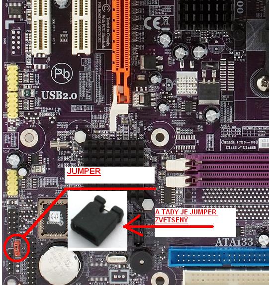 tak tohle je deska ze stol. pocitace a jumper se vetsinou nachazi pobliz baterie (takova vetsi baterie jako je treba v hodinach nebo v zapalovacich s LED diodou tak jsou tam s ni) na obrazku je zakrouzkovanej do cerveneho kolecka... hlavne az ho vyndas (ZA VYPNUTEHO PC ZE ZDI !!!) si pamatuj z jakych pynu ho vyndas jsou jen tri a tak si pamatuj na jake strane byl !!! je to 50na50 bud komp nezapnes kdyz ho das na spatnou stranu a nebo ti to ohlasi po zapnuti