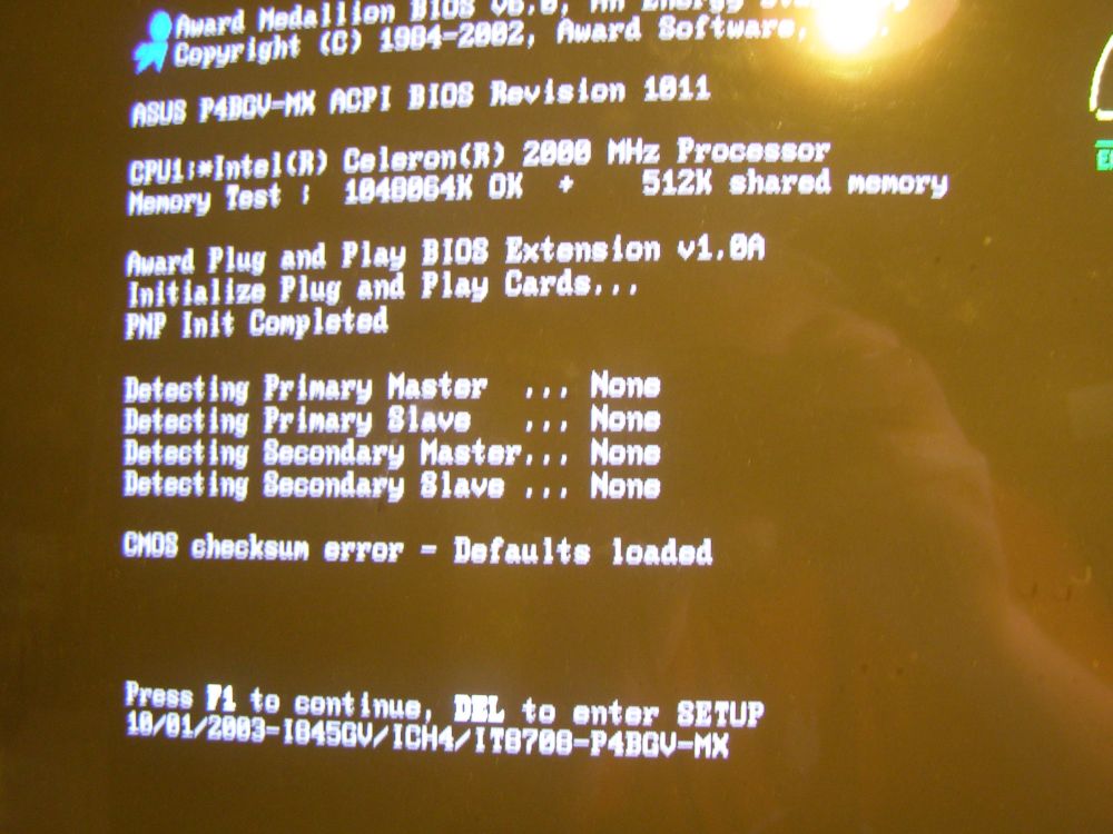 Po odpojení všeho - mě to do Biosu pustila na Advantage nastavení - A hned jsem musel rozhodnout jestli vyberu Auto - nebo 2000 (MHz??) - Jednalo se o CPU. Zjistil jsem, že jsem neodpojil mechaniku - po jejím odpojení počítač najel na úvodní černou obrazovku a nehnul se (viz screen) .