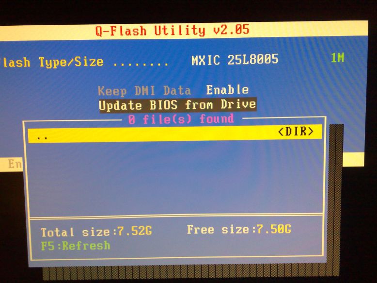 Pokusil jsem se flashnout bios základní desky GA-EP45-DS4 - Intel P45, bohužel se mi to však nějak nedaří.Stáhnul jsem si nejnovejší verzi biosu F9 (ještě je F10 beta, ten jsem zkoušel také) odzipoval, nahrál na flashku, restartoval PC skocil jsem do biosu, dal F8 objevilo se okno Q-flash flashku vidí, ale nevidí na ní žádné soubory, viz obrázek?