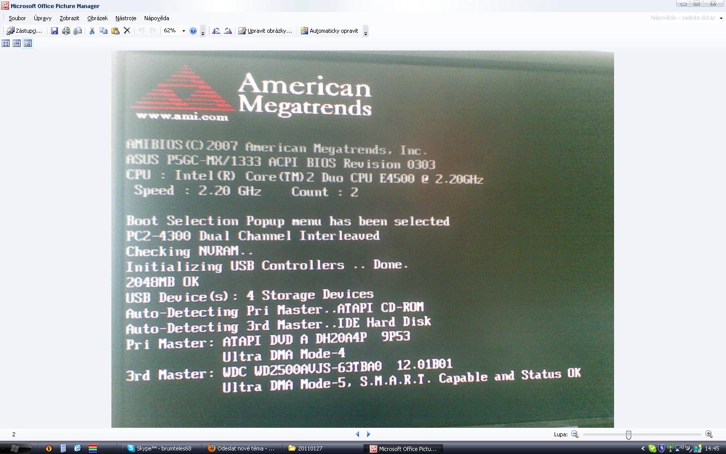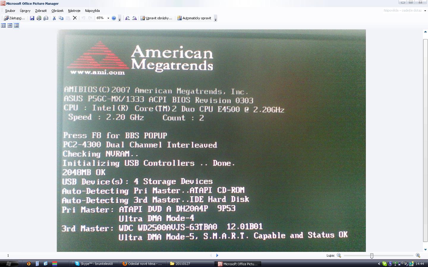Dobrý deň. Prosím o radu s mojím problémom. Brácha mi doniesol PC, aby som mu preinst. sys pretože s ním mal problémy. Mal tam vistu, a chcel XP. Začal som instalovať a všetko bežalo OK až do kroku, kedy sa PC reštartne a malo by rozbaľovať inštalačku na disk. To je už po naformátovaní oddielu. Ibaže po restarte mi nabehla hláška v tom zmysle, že nie je nožné nájsť systém, jej presne znenie si už nepamätám a prerušilo instaláciu. Keď som to skušal znova, tak opäť iba do reštartu pc a znovu tá istá hláška, preto som vybral jeho HDD a vlpžil som ho do svojho compu, kde som mu nainstaloval pôvodnu vistu. Všetko prebehlo v poriadku, vo svojom compe vidím jeho disk, spustím vistu, len keď ho prehodím do jeho pc, tak sa mi nespustí nič, a čo je najhoršie nepustí ma ani do biosu. Pri štarte mi nahodí iba to čo vidíte na priložených screenoch, ten druhý obr. je po stlačení F8. Skúšal som už iný zdroj, prehodiť ramky, poprípade som tam nechal iba jednu, resetoval som bios ...proste nepomáha nič a doska ani nepípa.