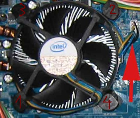 mam od koupení procesoru s vetrakem problemy (jen s vetrakem vlastne). Větrák u CPU se mi odmíta "dozacvakanout" do MB u 2 z 4 těch držáků. Při instalaci se postupuje správně stylem zacvaknu 1 a ten protější a Konkrétně jde vždy o ty protější - viz obrázek- držáky 2 a 4 zůstanou volné (šipky si nevšímejte) a nejdou dozacvaknout ani po silném tlačení.