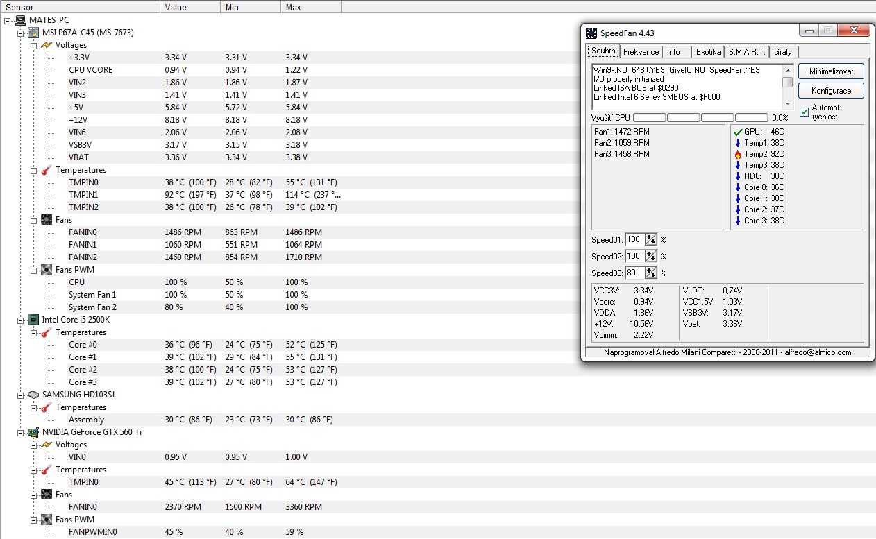 stáhl jsem si prográmek Speedfan abych mohl trochu omezit otáčky na ventilátorech, protože se mi zdálo, že mimo zátěž zbytečně jedou moc rychle a hlučí. V tomto prográmku jsem si všechno pěkně nastavil, ale mám problém s jednou teplotou, v klidu mám všechny teploty pod 40 stupňů (GPU, Core 1-4, HDD, Temp 1 a 3) a jeden ukazatel teploty je okolo 50 stupňů (Temp 2) a v zátěži jsou všechny taky v normě do 60 stupňů a ta jedna je na 120 stupních. Tak by mě zajímalo jestli je něco špatně v bedně, nebo to může být chyba toho programu. Díky za odpovědi, doufám, že jsem to napsal do správně kategorie, nebyl jsem si úplně jistý. :smile: