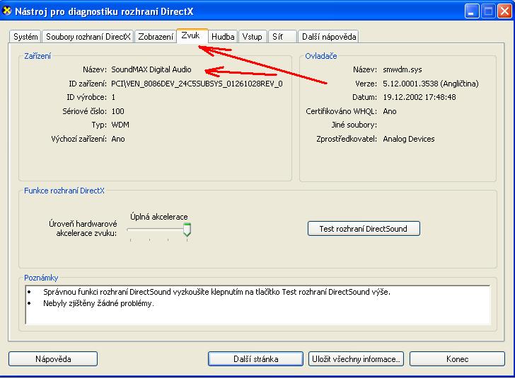 Zvukovku najdeš třeba tak, že do Spustit napíšeš dxdiag a potvrdíš, potom klikneš na záložku Zvuk.