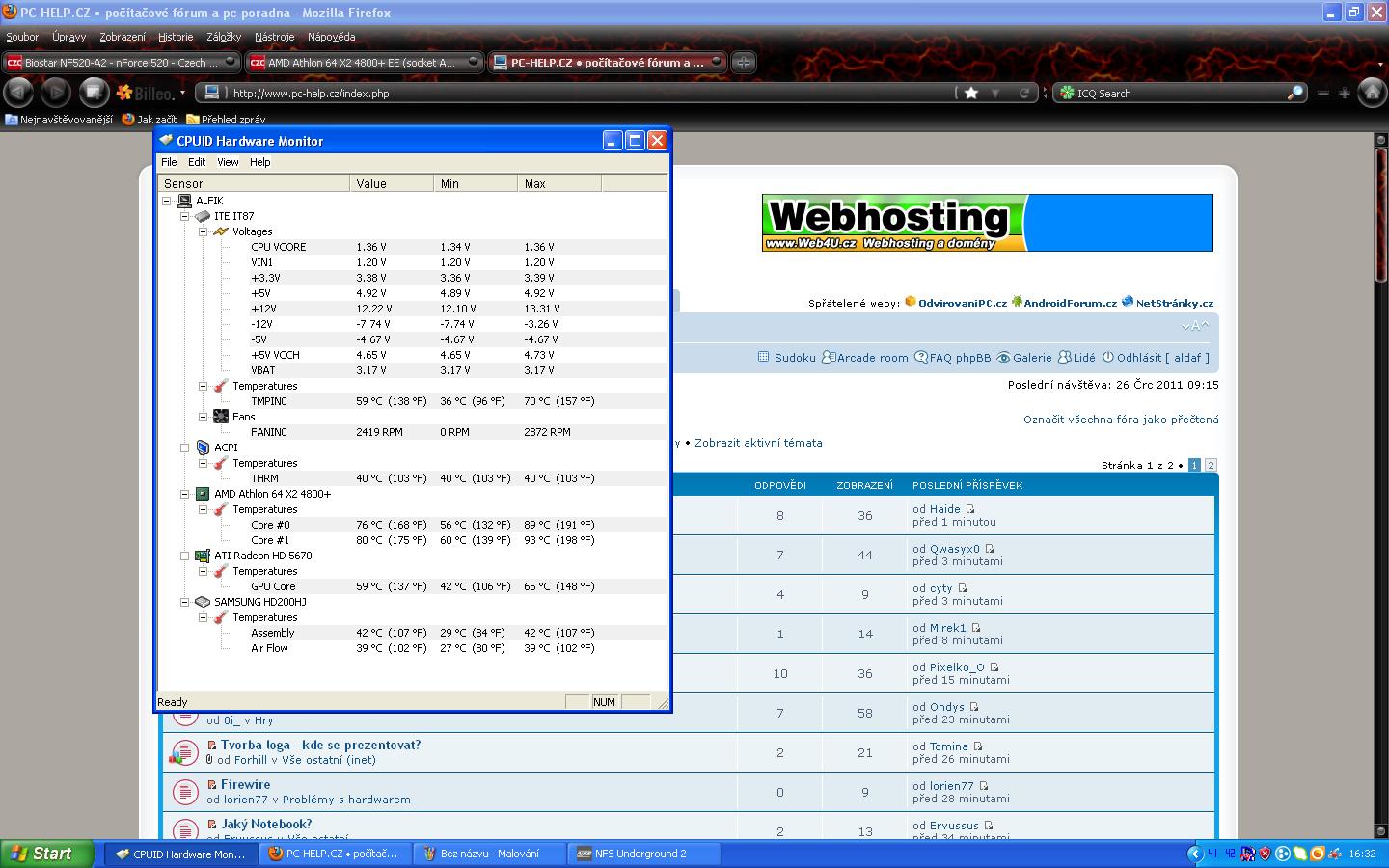 Zdravím lidi. Mám problém s vypínáním PC při hrách.Zde jsem naměřil přes HW monitor své teploty. Mám procesor AMD Athlon 64 X2 4800+ a základní desku Biostar NF520-A2 s chipsetem NForce 520. Jsou to sice starší kousky ale nikdy s nimi nebyl problém. Dalo by se to třeba vyřešit lepším chlazením? V tomhle se moc nevyznám takže o to prosím Vás. Díky za jakoukoli radu.