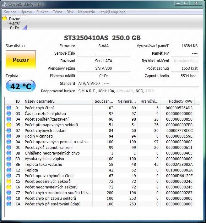 V každém případě doporučuji ihned zálohu dat. Stav disku není dobrý a má tendenci se zhoršovat.