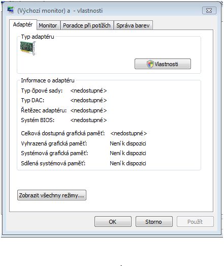 Prosim o radu, vcera se mi nahle vypnul pocitac, po opetovnym zapnuti nabehl monitor v rozliseni 800x600 (normalne mam 1680x1050). Kdyz jsem chtela zmenit rozliseni, vubec mi to tento typ nenabidlo, nejvic 1600x1200, tzn. ze mi vlastne zadna z moznosti neumoznuje kvalitni zobrazeni, bud je vsechno hrozne siroky nebo vysoky a navic mazly. Norton nic nenasel, vse ostatni se zda byt ok, az na prehravani videa - je cukave a nekvalitni (a neni to nastavenim rychlosti prehravani). Když dám "upřesnit nastavení" v rozlišení obrazovky, tak tam u informaci u adapteru je vsede "nedostupne" viz priloha. Dik za rady, J.