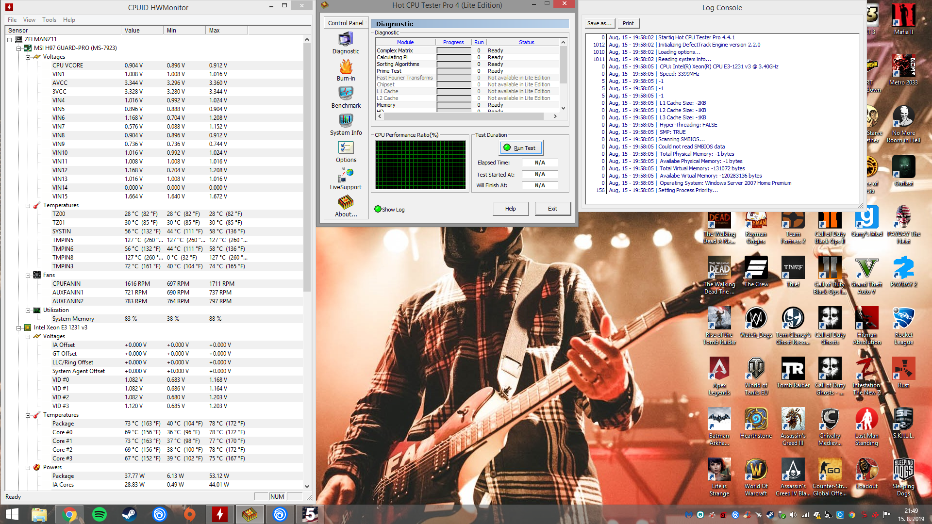 HWmonitor používám dlouhou dobu, kontroloval jsem teploty dost krát v různých situacích, nikdy tam procesor takových teplot nedosahoval. Když jsem u HWInfa viděl u procesoru 127 °C, tak jsem si myslel že to je nějaká chyba. U HWmonitoru dosahoval vždy CPU, co si tak vybavuji, okolo 50 °C. Viz starší screen, co jsem našel v telefonu.