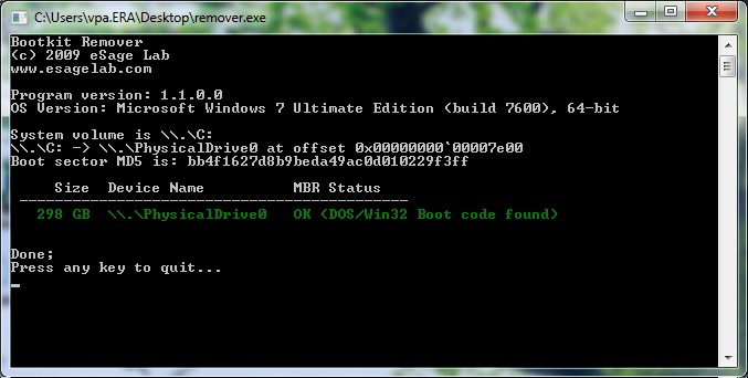 A tady ještě Printscreen z toho removeru. Každopádně Vám chci moc poděkovat, strašně jste mi pomohli jsem moc rád, že je systém opět čistý a zbavil jsem se problémů i na datovým oddílu. Měl jsem strašně krátkou životnost systému, protože se začal špinit od tý datový partition a tu se mi nechtělo formátovat. Díky moc a doufám, že ten boot sector už bude ok. Podle logu mi to nepřišlo nějak nakažený.