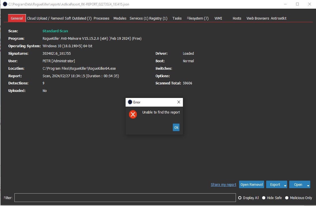 hledal jsem logy v ProgramData/Roguekiller... take tam nejsou