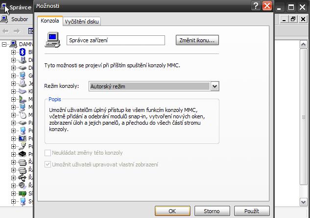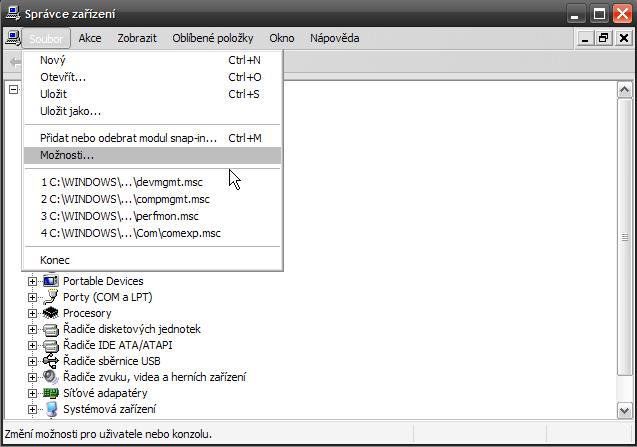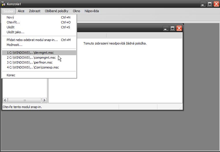 Otevře se ti okno Konzole1. Tam klikni na Soubor a zvol možnost "devmgmt". Otevře se ti Správce zařízení, v něm Soubor-->Možnosti A změň režim konzoly na Autorský režim. Změny ulož. Měl by se tím zobrazit strom Konzoly ve Správci zařízení.