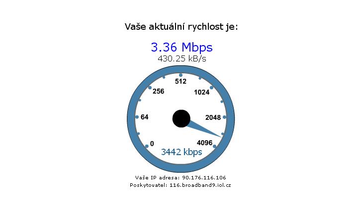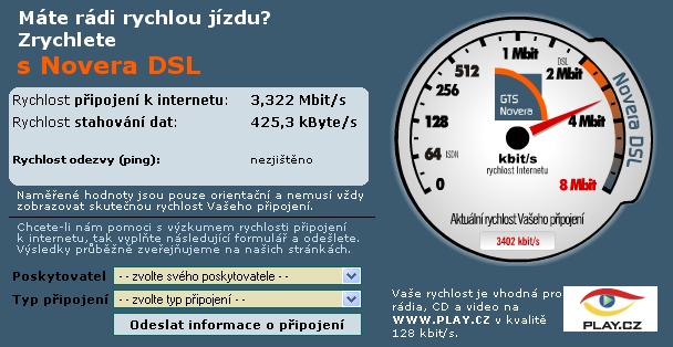 Prostřednictvím koho jsi měřil rychlost? Před chvílí jsem si rychlost projel na dvou měřácích a jeden tvrdí, že mám 2237,54kbit/s a 201,58kbit/s, jiný 3456,5kbit/s a 432,06kbit/s. Hádej kterému věřím?