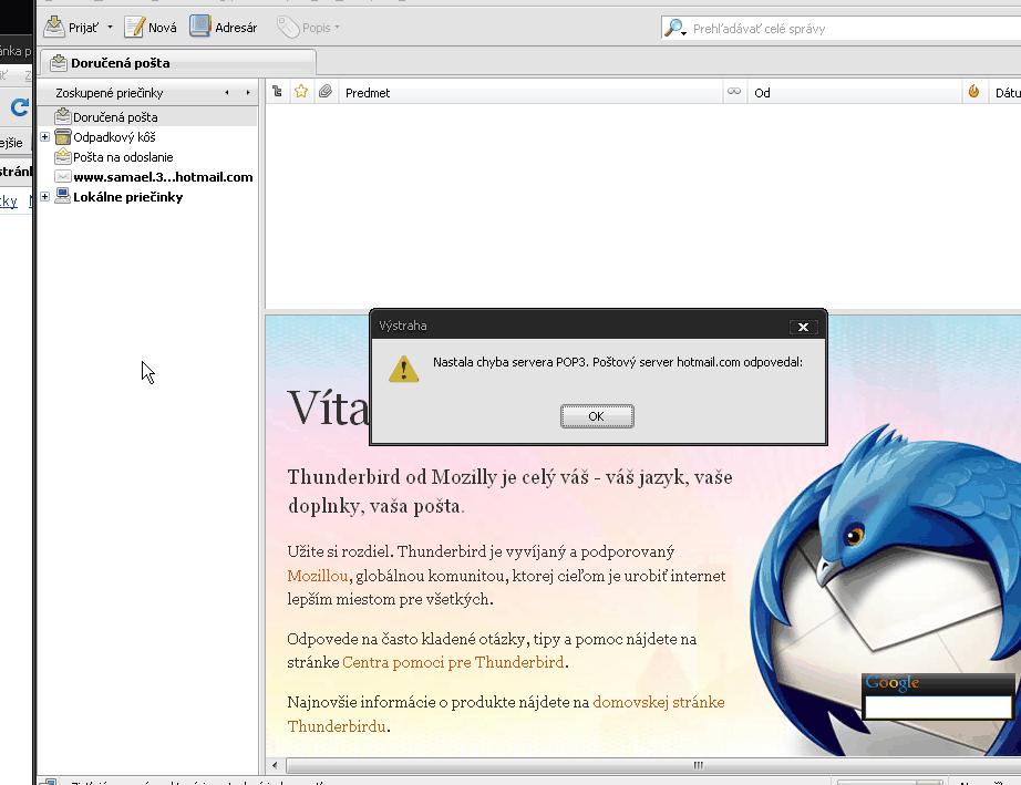 Reinštaloval som XP sp3 ( Anglická verzia Sj doinštalovaný) a kedže poštového klienta mám Thunderbird tak som ho inštaloval....ako predtým. Problém je že ma neprihlási na hotmail.com a skončí to hláškou "nastala chyba POP3.Poštový server hotmail.com odpovedal: " vid obrázok. Ak sa prihlásim na hotmail v gooli neni problém. Neviete čo s tým? Poradíte? :roll:
