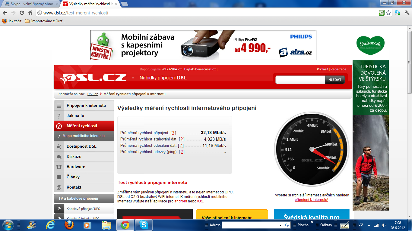 Čau, čau - tento měřák, co jsi mi sem dal, tak měří totálně špatně... Když pustím stahování z http://www.slunecnice.cz , tak se mi daný soubor stahuje 11,5mb/s. A když nahrávám na http://www.Uloz.to , tak to jde 9990kb/s. Jedniné měřáky, které jsou stavěné na tak vysokou rychlost je: http://www.speedtest.net a i bych řekl, že http://www.rychlost.cz .