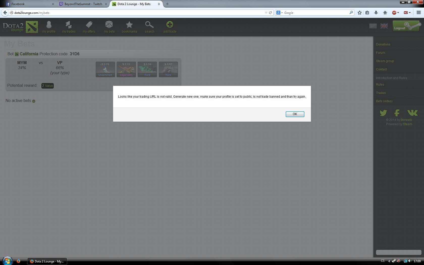 Problém je následující... KLdyž sem si chtěl vsadit na kohokoliv tak mi D2L po načtení bota hlásí chybu a nevím co s tim už jsem snad zkusil vše... Vygeneroval jsem si nový URL kód a podíval se do nastavení Inventáře a vypnul a zapnul SteamGuarda stejě nic... Prosím poraďtě někdo co s tim