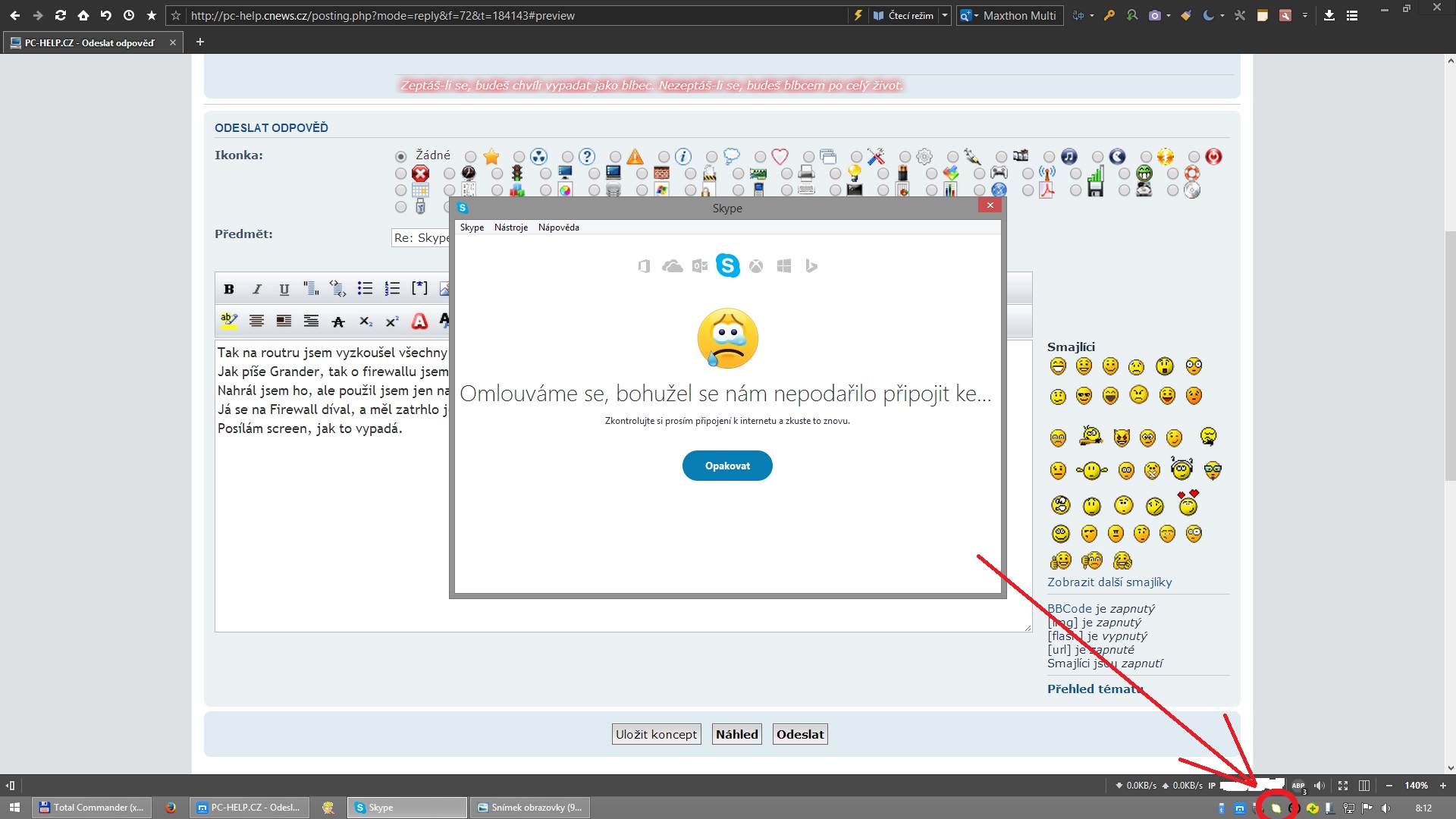 RIKI22 píše:Riešil som nedávno NTB , kde bol problém Skype.Nebolo možné sa prihlásiť so žiadným účtom.Hľadal som chybu v OS.Nakoniec som si všimol , že na router vyšla novšia aktualizácia firmware.Po aktualizácií už žiadný problém.Možno by stačil aj reštart routra.Prípadne ho skús vypnúť a zapnúť.