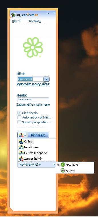 Doporučuji použít QIP. Má lepší ovládání statusu. Můžeš si nastavit, jestli chceš být neviditelná pro všechny (budeš online, ale nikdo tě online neuvidí) nebo jen pro určité uživatele (budeš online, ale online tě uvidí jen někdo). U icq tohle nejde (tedy myslím, viděl jsem to naposledy u přítelkyně...).