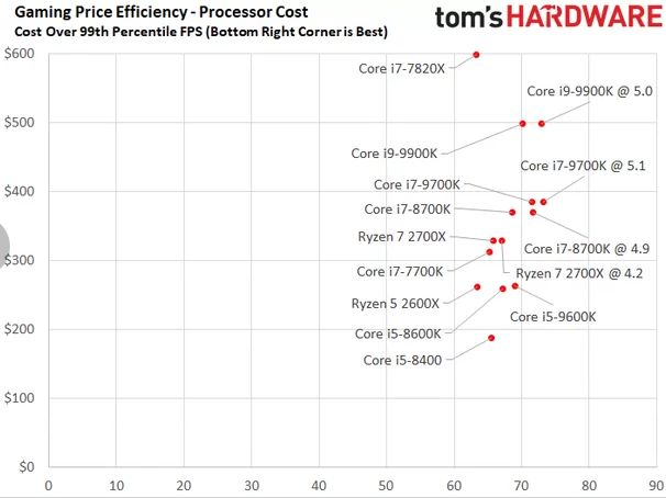 Na práci si ten i7-7700K za ty peníze nekoupí nikdo. Tady se ale většinou skládají pc na hraní a herní výkon je něco jiného než skore v passmarku. Graf ukazuje, jak si co stojí z pohledu herního výkonu a ceny, není už úplně aktuální, protože ceny intelů se zvedly, ale herní výkon zůstal. I z toho grafu je zřejmé, že i7-7700K má dnes cenu úplně jinde. (co je víc v pravo je výkonnější)