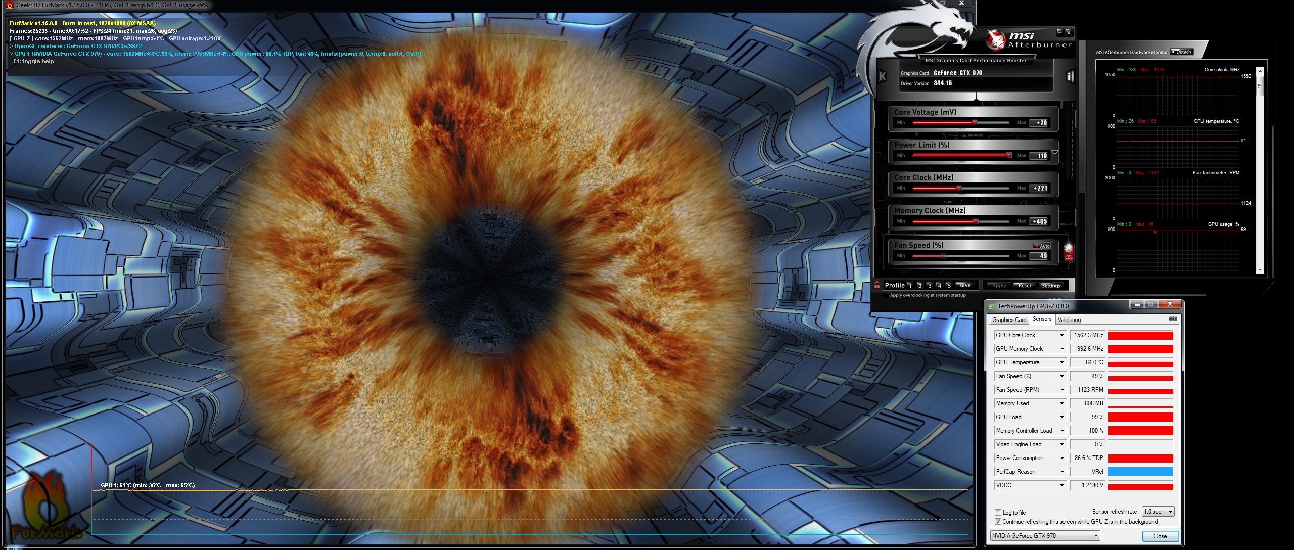 Chladič Twin Frozr 5 - mimo zátěž netočí vůbec, v zátěži je tichý (1200rpm, nekteré karty točí v zátěži i k 2500rpm) a karta má teploty do 65°C i po přetaktování na 1550Mhz v 100% zátěži, viz screen po 15minutách ve Furmarku.