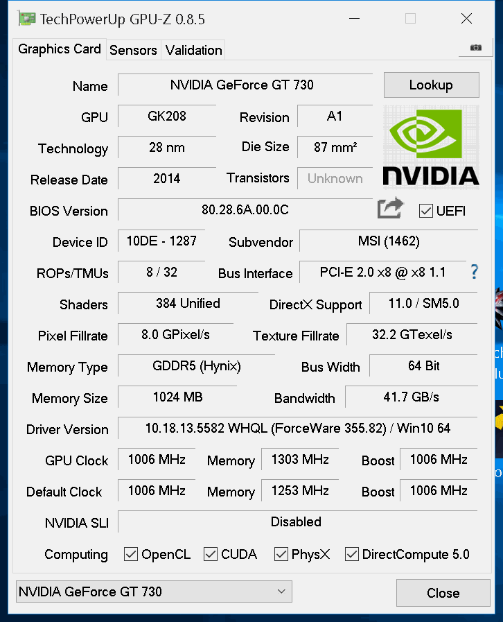 Čip NVIDIA GeForce GT 730- Frekvence čipu 1006 MHz, 1 GB GDDR5 paměti s frekvencí 5000 MHz efektivně, 64bitové rozhraní, 3D Vision Ready, podpora DirectX 12 a OpenGL 4.4, DVI, HDMI, VGA, PCI-E 2.0 x16 rozhraní