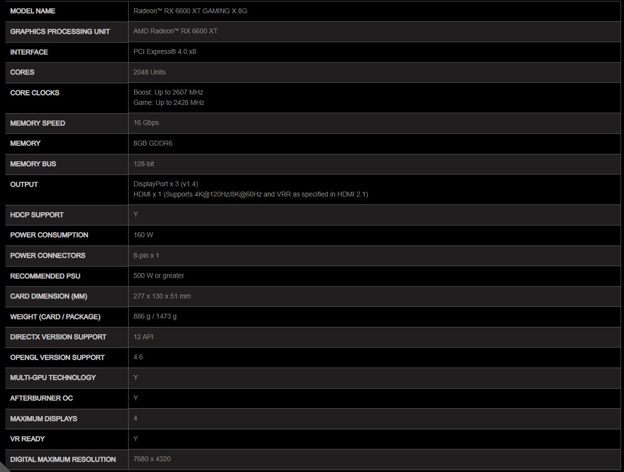 Jedná se herní grafickou kartu společnosti MSI. Pro připojení využívá rozhraní PCIe 4.0 x8 (PCIe 3.0 kompatibilní). Poskytuje frekvenci až 2428 MHz a až 2607 MHz boost a 8 GB GDDR6 paměti s rychlostí 16 Gb/s. Má 128-bit sběrnici. Pro připojení zařízení nabízí 1x HDMI 2.1 a 3x DisplayPort 1.4 konektor. P Podporuje technologie a software OpenGL 4.6, DirectX 12 Ultimate, AMD FreeSync, AMD Radeon Anti-Lag, hardwarový Raytracing.