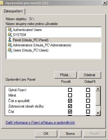 Zajímavé je, že toho uživatele "Pavel" jsem přidal jen na oddíl D, ale ihned to síťové propojení začalo fungovat i na oddílu C, kde uživatel "Pavel" není v seznamu.