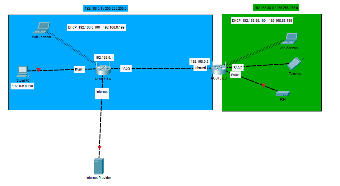 Router A rozvádí internetové připojení po bytě pomocí 2.4G/5G Wi-Fi, a z FastEth1 mi vede TP do stolního počítače.