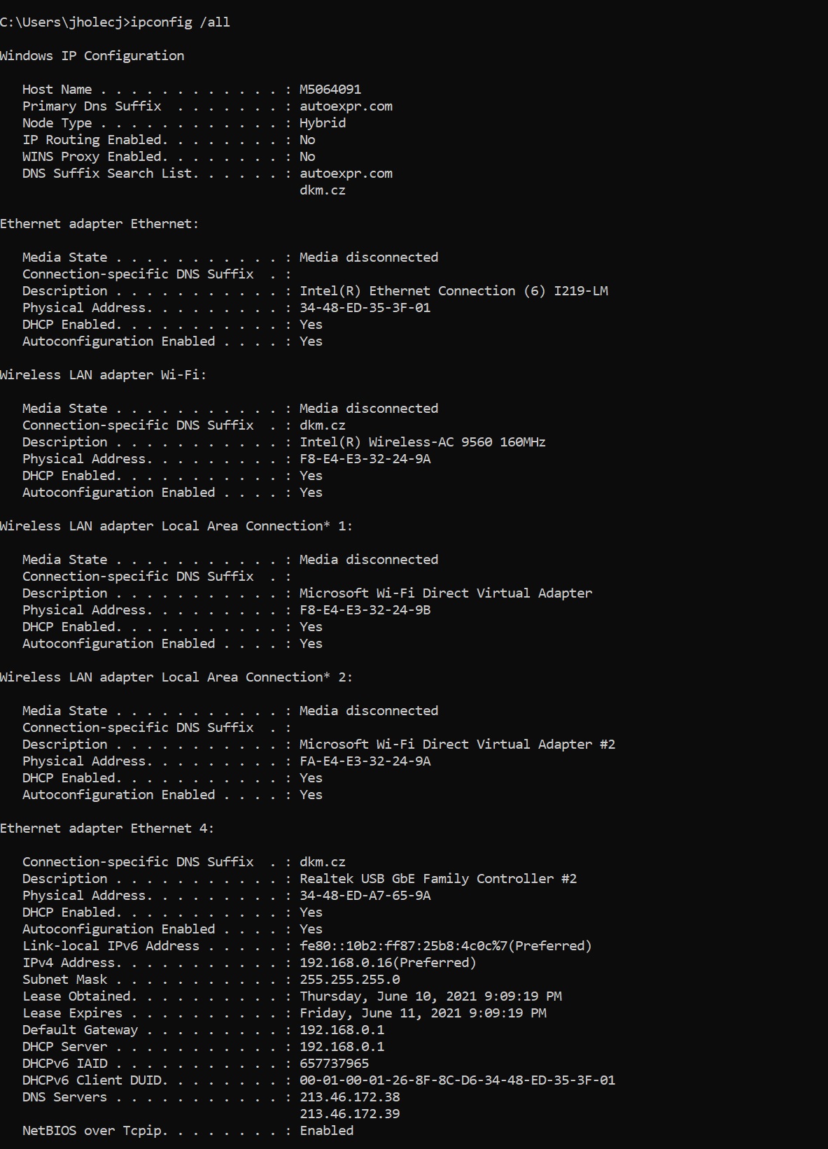 Konkretne hodnota ip adresy, gateway a DNS - jak se lisi od toho vypisu z notebooku.