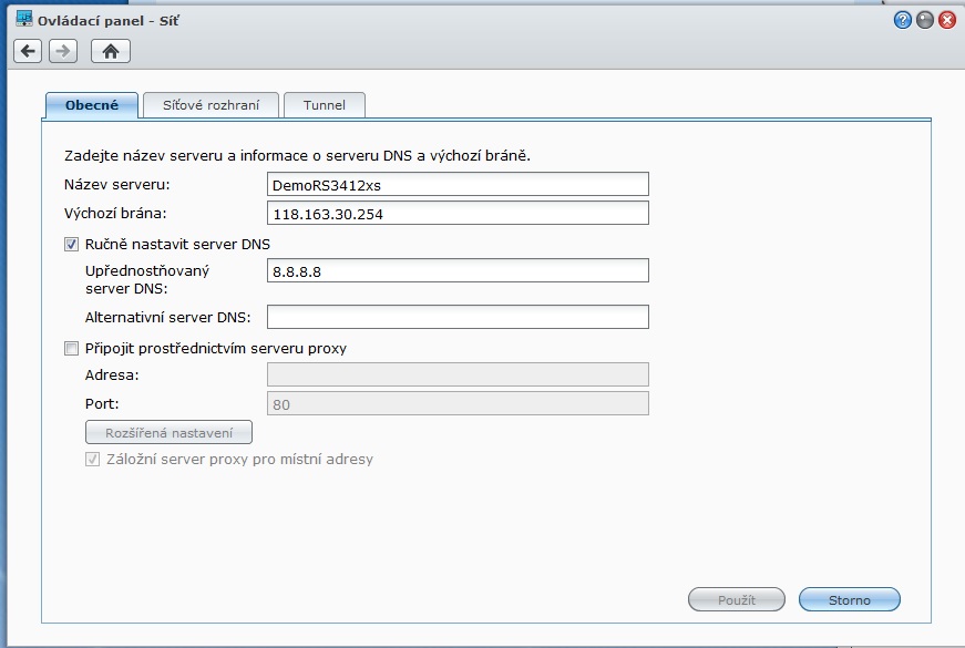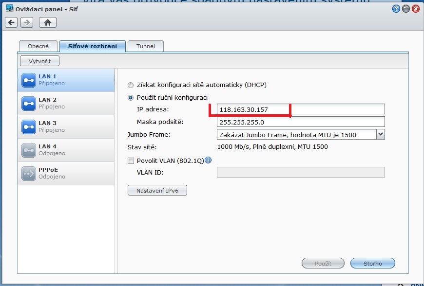 kromě toho na synology nastavíš bránu (např. 192.168.1.1) a DNS (okopíruješ to co má router, nebo 192.168.1.1)