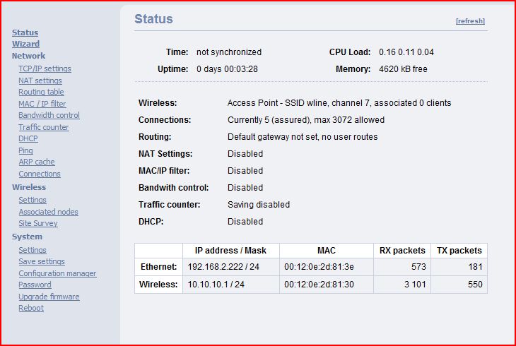 Celé to je ale nějaké divné. Nevím, že by v továrním nastavení byl vyplý NAT, DHCP a TX power na 0db...