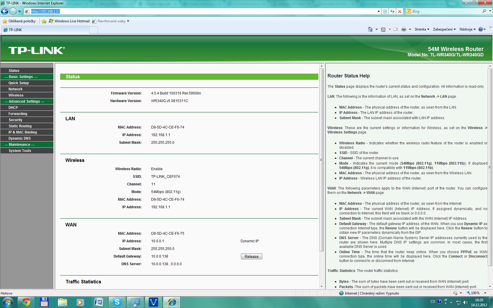 Internet tahám do wifi routeru přes modem, kterej je úplně v jiný mistnosti. A internet máme od O2. Udělal jsem screen jak to mám nastavený teď a jak mi funguje internet ale na Dynamic IP. A tady mám ještě výpis z ipconfigu