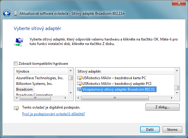 Aha, něco mě napadá. Správce zařízení -> Právé tl. myši na ten Broadcomm adaptér -> Vlastnosti -> Ovladač -> Aktualizovat ovladač
