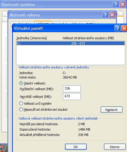 Omlouvám se, přehlédl jsem volné místo. Tak nastav větší virtuální paměť. Buď zaškrtni "Velikost určí systém", nebo klikni na "Nastavit" a největší velikost nastav na 1500MB (při RAM 1GB).