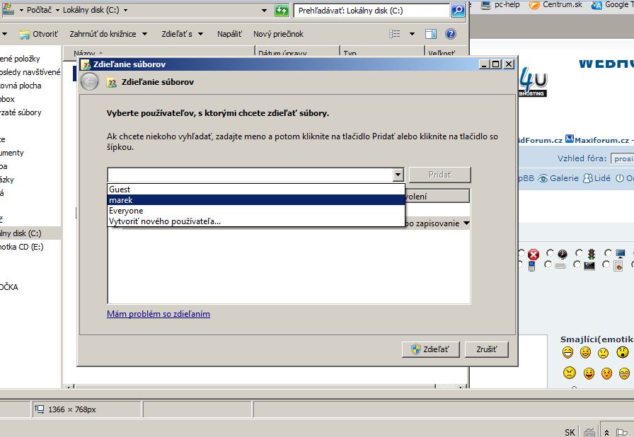 Mam 2 pc s win7 s LAN................. ja som uzivatel "marek" a ten druhy pc tam je uziv. "karel" Vsimnite si foto co som poslal. Preco nevidim v zozname pouzivatela "karel"? Ale vidim tam iba seba "marek"? Siet mi funguje dam everyone a karel vidi subory ale ja nechcem everyone zdielat iba "karel"