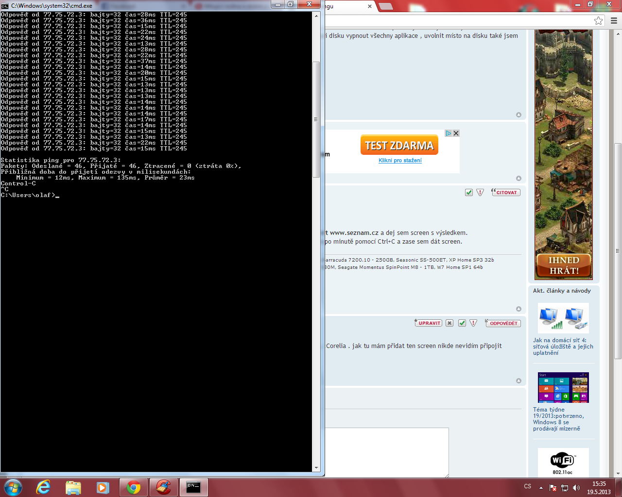 Dobrý den, v posledních týdnech sem zpozoroval zvýšení pingu .Např v battlefieldu sem měl 20-40 ping max 60(občasně při vytižení síte.) ale tet mam tak 80-150 a co tři minuty až 1500 a potom mne to vyhodí.To samé u WoT. i na chrome se mi pomaleji načitají stránky. S tímhle problémem nevím co mám dělat. zkoušel jsem čistení registru defragmentaci disku vypnout všechny aplikace , uvolnit místo na disku také jsem zkoušel projet pc antivirem. moc nepomohlo.