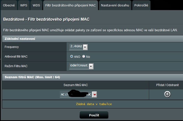 MAC filtr - viz obrázek. Pokud dáš odmítnout, pak všechny MAC adresy ve filtru budou odmítnuty, ostatní se dostanou. Pokud dáš přijmout, pak MAC adresy ve filtru budou přijaty, všechny ostatní odmítnuty.