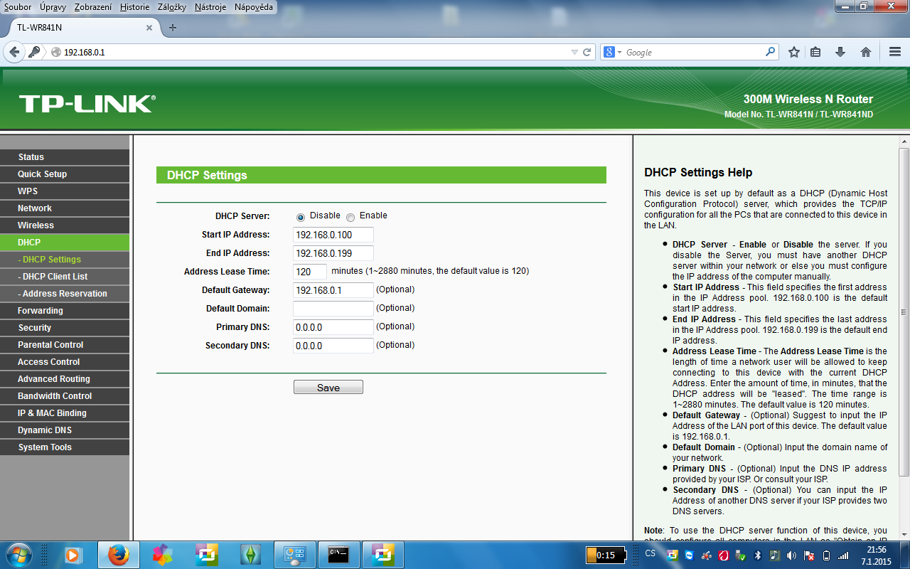 Propojení je následující: Z antény bezdrátového poskytovatele jde kabel do switche, z něj do stolního PC, kde je tiskárna a tu potřebuje sdílet na ostatních noteboocích. Ze switche jde opět kabel do wifi routeru a v něm je podle mne nějaký problém. (Někde jsem se dočetl, že by se mohly bít nějaké překlady adres NAT s původního routeru s tím novým routerem, ale nevím jak staré adresy NAT odebrat) Router slouží ještě i jako switch pro kabelové připojení v dalším pokoji.