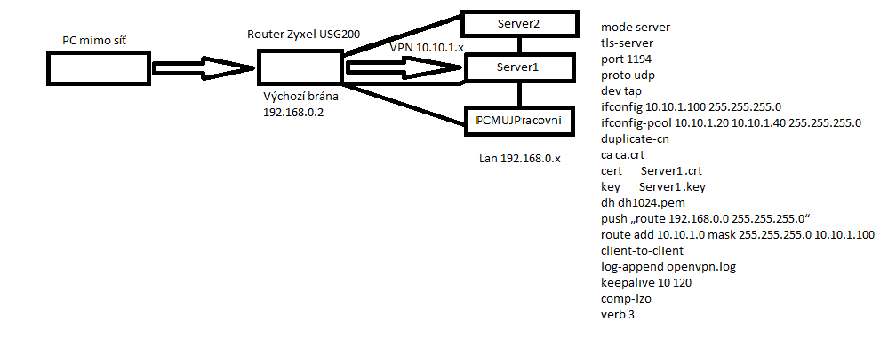 Zdravím, už týden se snažím vytvořit si vlastní VPN tunel do firemní sítě pomocí openVPN, ale uvízl jsem na mrtvém bodě. VPN tunel jako takový mi funguje. Přes OpenVPN se připojuju na počítač Server1. Pokud u sebe na počítači zadám adresu \\Server1, můžu spravovat všechny nasdílené soubory. Pokud se ale chci připojit na Server2 nebo na PCMujPracovni, nejde to. (Adresy 192.168.0.x) Procházím všechny možné návody jak na to a všude píší, že je to naprosto jednoduché, že do toho konfiguračního souboru stačí napsat příkaz push "route 192.168.0.0 255.255.255.0" a vše bude fungovat. U mě to tak bohužel není. Můžete mě prosím nakopnout, co dál... Předpokládám, že když už funguje VPN jako taková ve firewallu už to asi nebude. Sem tam se zmiňují a nějaké routovací tabulce a pod ní je vždy nějaká sekvence příkazů. Bohužel nemám tušení, kam je napsat. Všechny počítače na síti jsou Windows.
