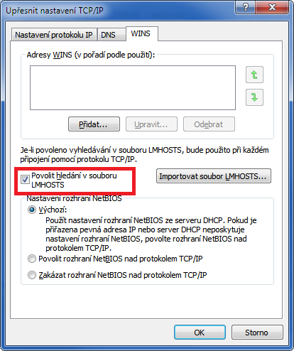 Zkus ve vlastnostech protokolu IPv4/upřesnit, záložka WINS zrušit zatržítko u lmhosts.