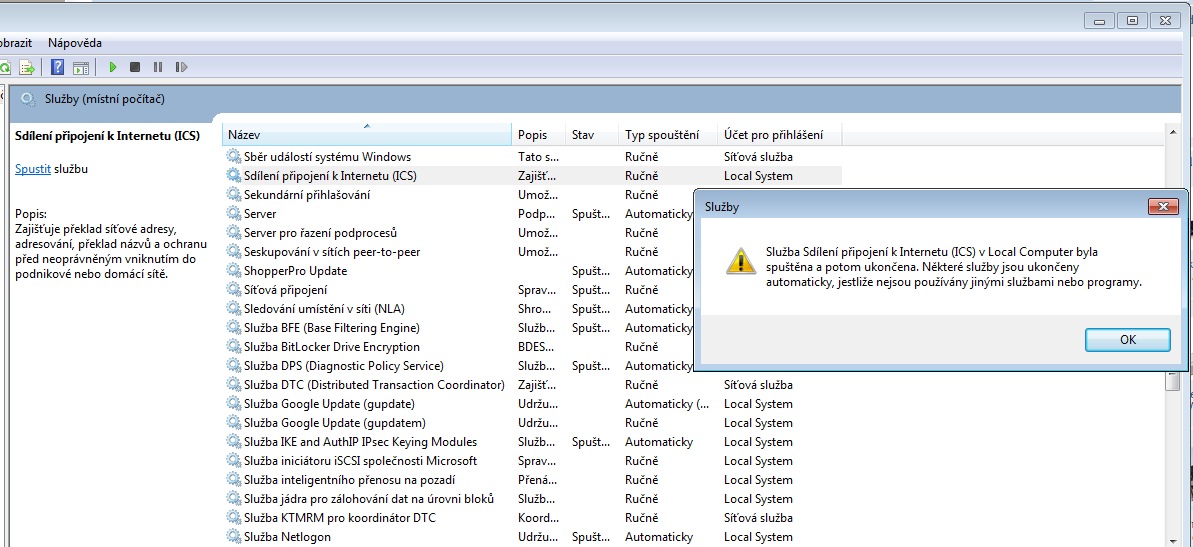 Spustil jsem služby, služba "Sdílení připojení k internetu ICS" byla nastavena na "automaitcky", nastavil jsem ji na "ručně" a dal spustit, po spuštění se služba zastavila s hláškou viz příloha.