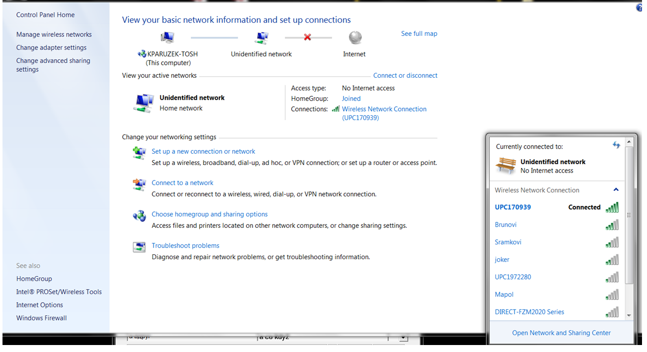 Koupil jsem novy notebook Toshiba s Windows 7 a první pripojeni k domaci wifi/internetu probehlo bez problemu. Ovšem pokud NT vypnu a znovu zapnu, tak uz se automaticky k siti nepripoji, ba co vic, ani další jiné pokusy k pripojeni rucnim nastaveni anebo odstraneni této nakonfigurovane site/wifi a pripojeni znovu přes zadani hesla k wifi nevede. Sice tvrdi, ze pripojen je k "unidentified network" ale na internet uz ne (viz screen nize). Jedine co pomuze je restartovani routeru (od UPC). Doma jinak vse ostatní bezi normalne a pripojeni probiha v poradku na ostatních NT, mobilech, tabletech. Takto to "beha" cele 2 mesice.