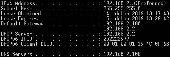 Tady je výpis ipconfigu, když to tak nějak fungovalo, ale připojení k internetu bylo velmi pomalé. Nicméně to fungovalo, DHCP server je nastaven na správnou IP, ale u výchozí brány a DNS musela být přidána IP 192.168.2.100.