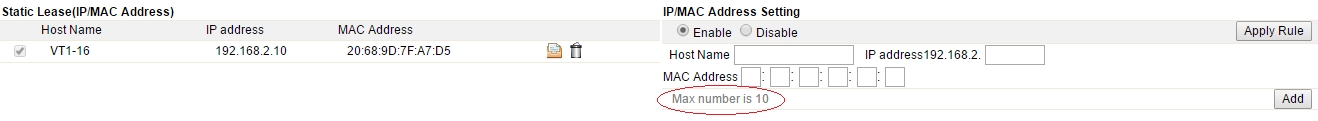 Jenom se bojím jedné věci, v nastavení wifi routeru je napsáno, že takto můžu zadat pouze 10 adres :(. Asi jich víc obsloužit nedokáže, ale je mi to s podivem. Tady je screen: